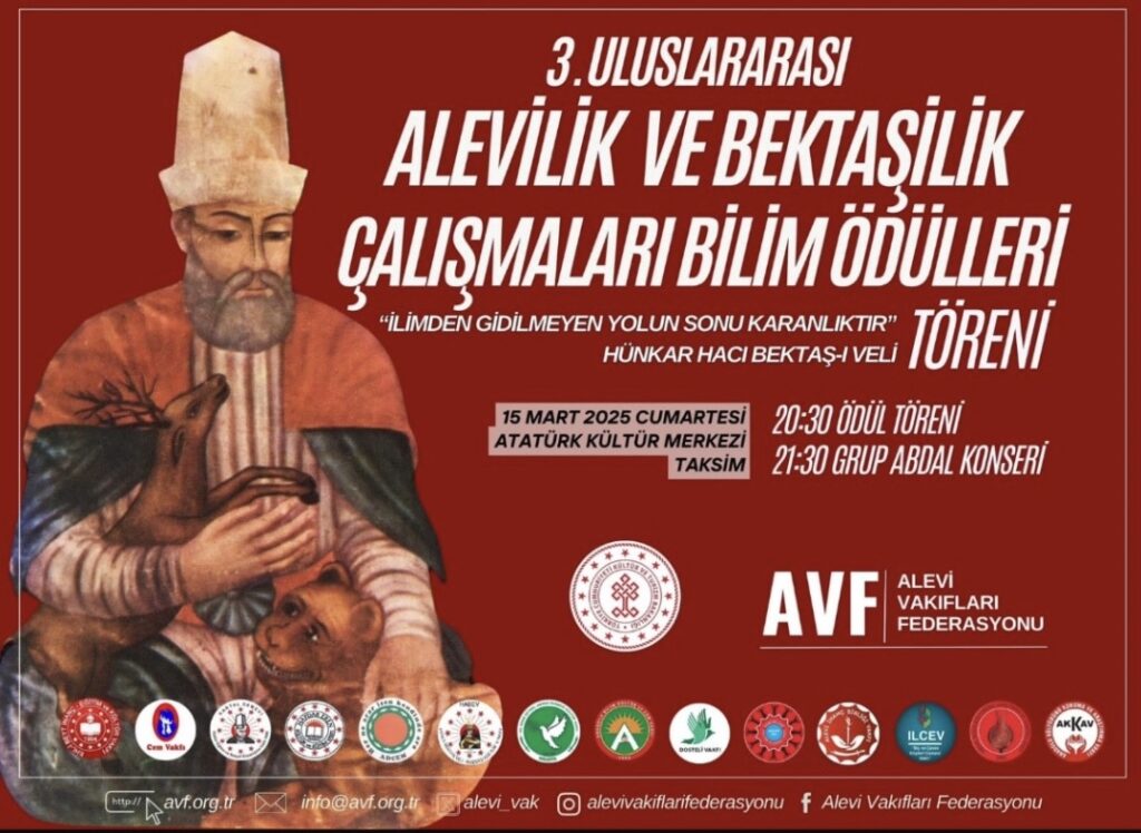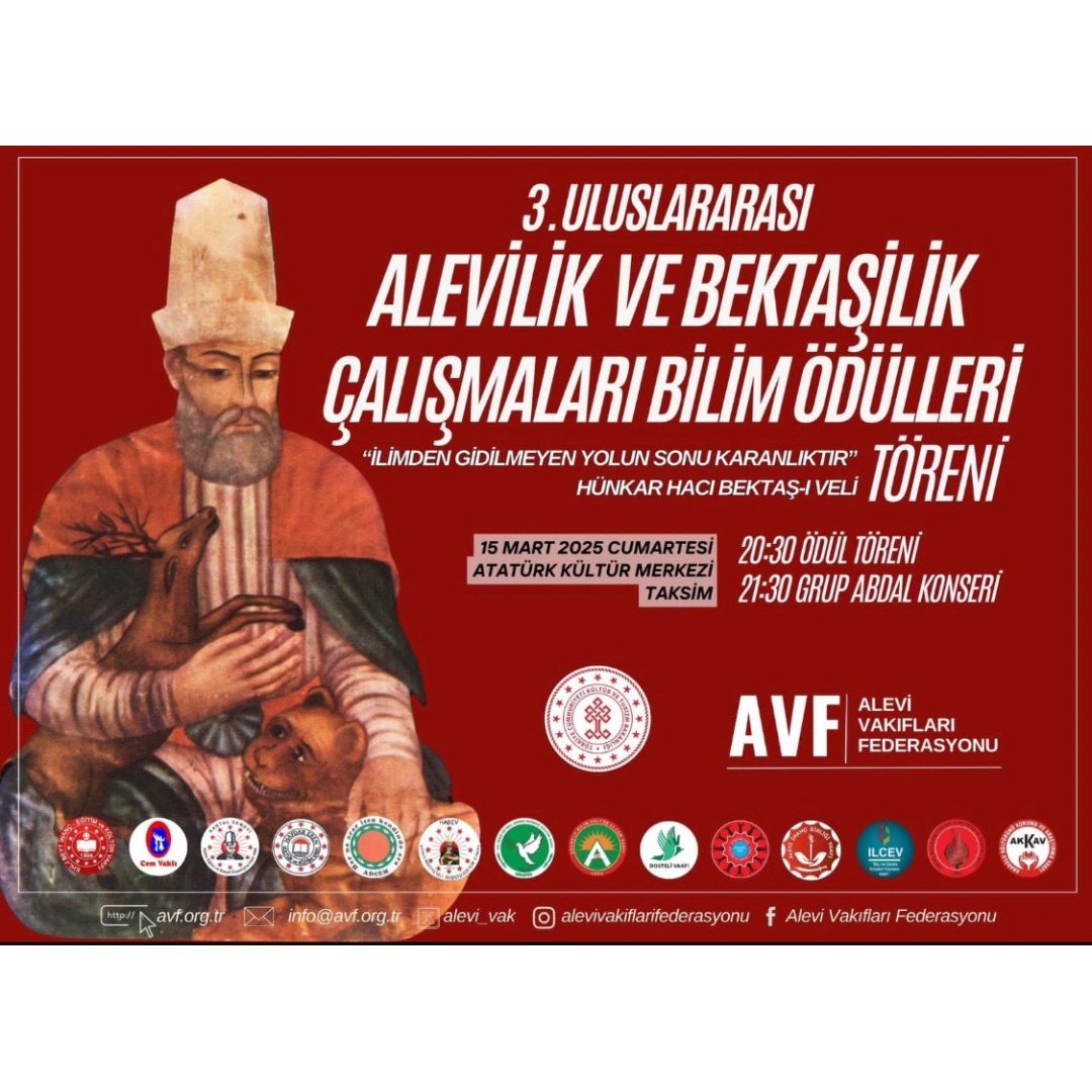 Alevi Vakıfları Federasyonu’nun düzenlediği 3. Uluslararası Alevilik ve Bektaşilik Çalışmaları Bilim Ödülleri’nin kazananlarını 15 Mart 2025 tarihinde Atatürk Kültür Merkezi (AKM)’nde gerçekleştirilecek törenle açıklayacak. Etkinlik kapsamında Grup Abdal’ın konseri de izleyicilerle buluşacak.