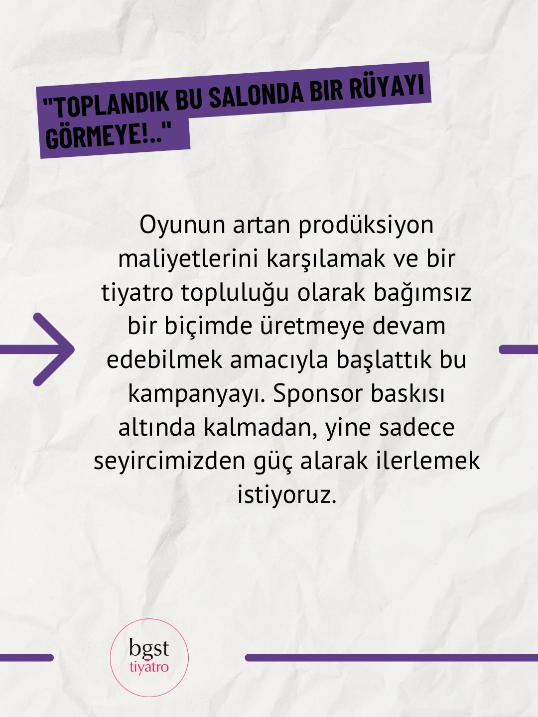 BGST Tiyatro, artan üretim maliyetleri nedeniyle yeni oyunu “Bahar Noktası Soruşturması”nı tamamlayabilmek için seyircisine ve sanatseverlere destek çağrısında bulunuyor.