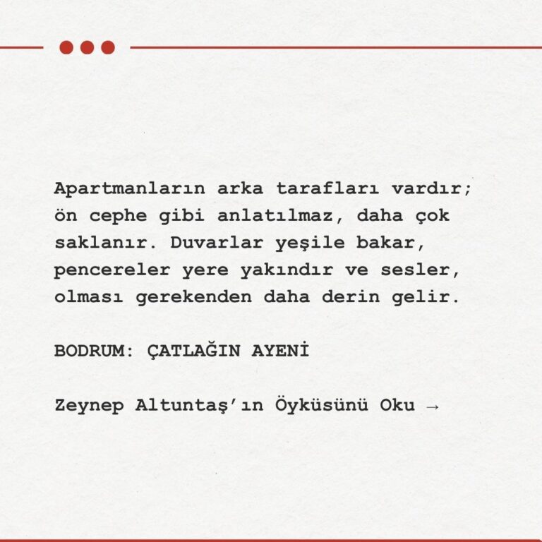 Apartmanların arka tarafları vardır; ön cephe gibi anlatılmaz, daha çok saklanır. Duvarlar yeşile bakar, pencereler yere yakındır ve sesler, olması gerekenden daha derin gelir. O gün, binanın arka tarafında sokak hayvanları için mama bırakırken duyduğum miyavlama da böyle bir sesti. Nereden geldiği belli olmayan, bir boğazdan çok bir boşluktan yükselen bir çağrıydı bu.