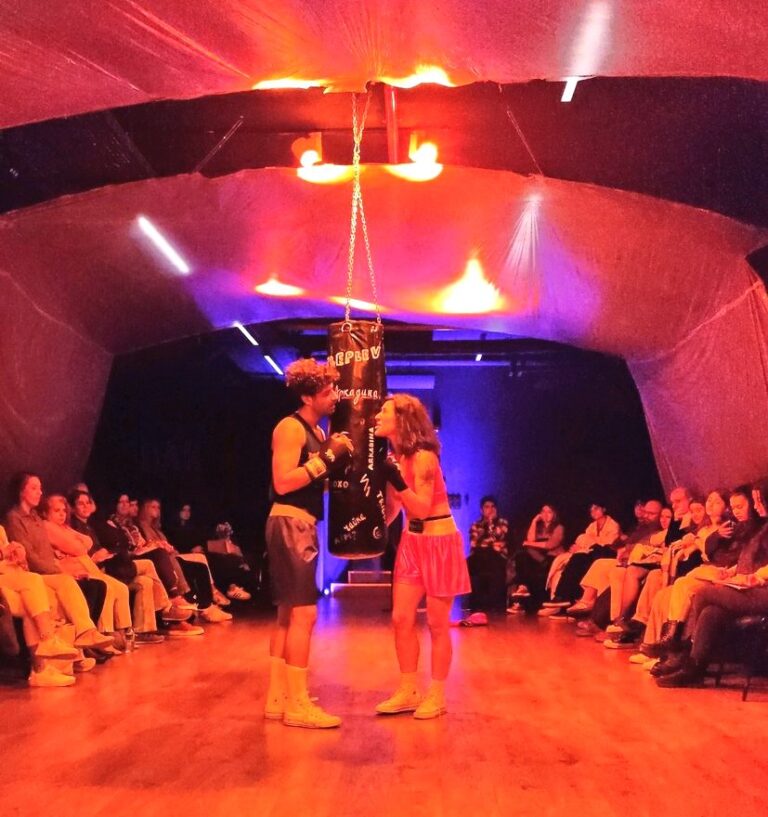 Başak: Sanatla var olmak isteyen bir kişinin baş etmeye çalıştıklarıydı diyebilirim. Treplev bir şeyler üretmek isteyen bir kişi. Bunun ne kadar iyi ya da kötü olup olmamasıyla hiç ilgilenmiyor aslında. Üretmek ve devam etmek istiyor ama bu isteği görmezden gelinerek, yok sayılarak reddediliyor. Hayatta kalmaya çalışıyor bir anlamda kendi kendine. Bu mücadelesini nasıl fiziksel aksiyona dönüştürürüz fikri beni çok cezbetmişti. Hep bir düello ve mücadele içerisinde Treplev. Bunu bir maç üzerinden, 4 roundluk ve hep kendisinin kaybettiği bir boks maçı üzerinden anlatma fikri üzerine düşünmek, seyirciye bu mücadelesindeki tutkusunu ama bir türlü olduramadıklarını aktarmak üzerinde çalıştık. Bir yer yer yönetmen/psikolog/yargılayıcı ebeveyn dış ses ile hayatını, ailesini, başından geçenleri sondan başlayarak anlatmak, metni yıkıp yeniden bozmak anlamında çok işe yaradı. “Yak tüm fikirleri!” Treplev için hayatının özeti sanırım. “Yak tüm fikirleri yak yak yak, çünkü ben aslında yokum yok yok yok.”