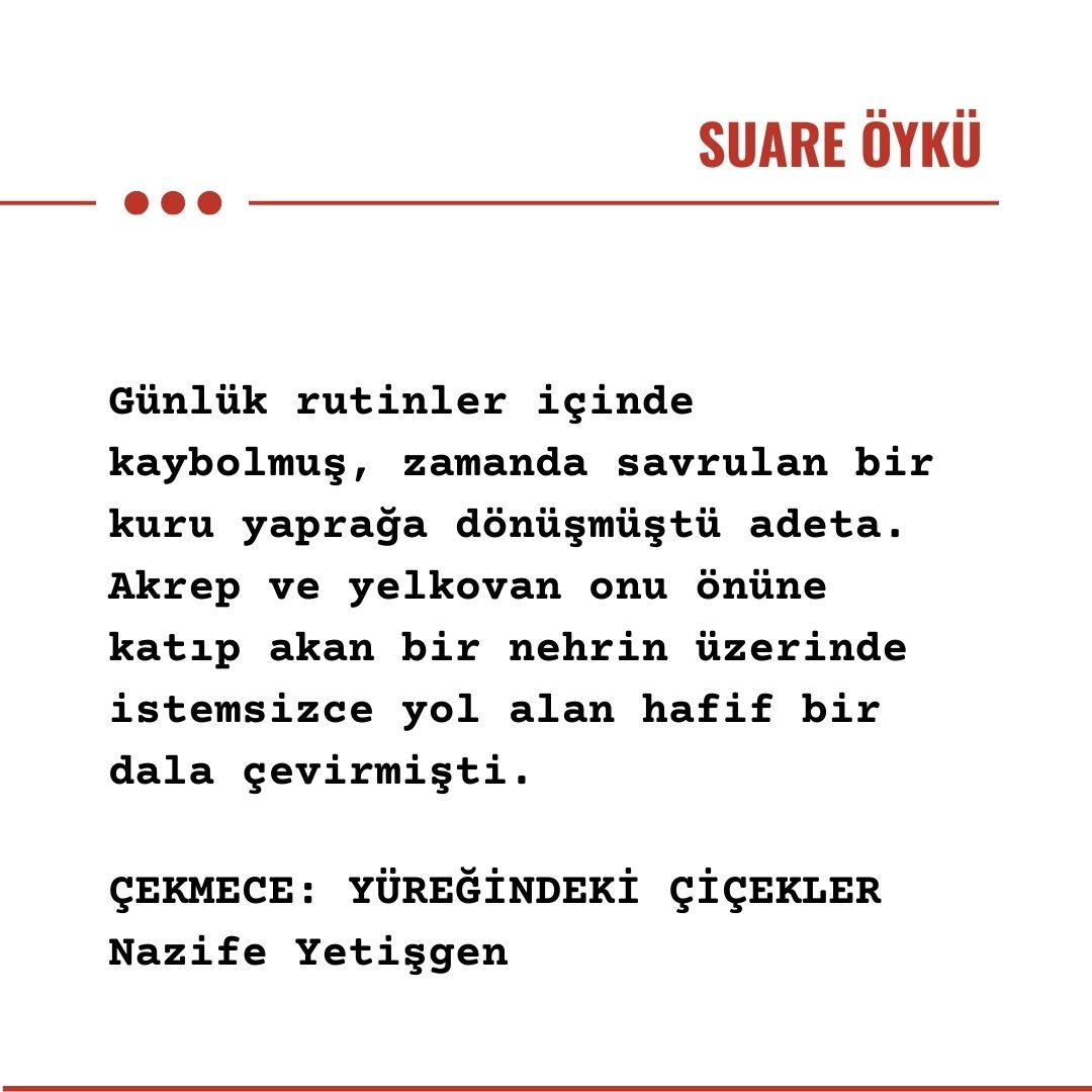 Çekmeceyi temizledi. Işıkları açtı. Suyunu yeniden verdi yüreğinde solan çiçeklere. Şimdi hayata tutunma zamanıydı… Zaman anne olduğunu hatırlama zamanıydı. Kapı çaldı. Tüm bu düşüncelerden sıyrılıp kapıya yöneldi. Açtığında yavrusu karşısında saçları örülmüş, gözünün içi gülerek ona bakıyordu…