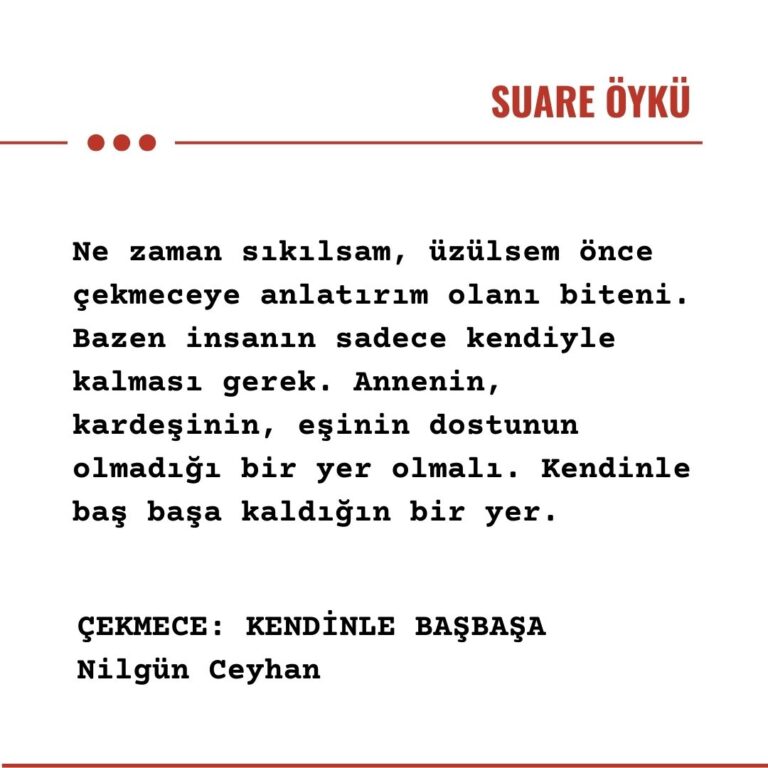 “Anneanneni kaybettikten sonra ben de kendime bu çekmeceyi yarattım. Ne zaman sıkılsam, üzülsem önce çekmeceye anlatırım olanı biteni. Bazen insanın sadece kendiyle kalması gerek. Annenin, kardeşinin, eşinin dostunun olmadığı bir yer olmalı. Kendinle baş başa kaldığın bir yer. Hadi artık bu kadar yeter. Çok konuştuk. Daha da konuşursak akşam yemeğini yetiştiremem,” diyerek mutfağa doğru yürümeye başladı.