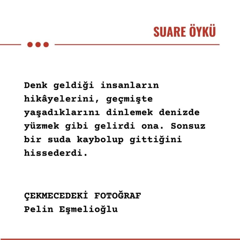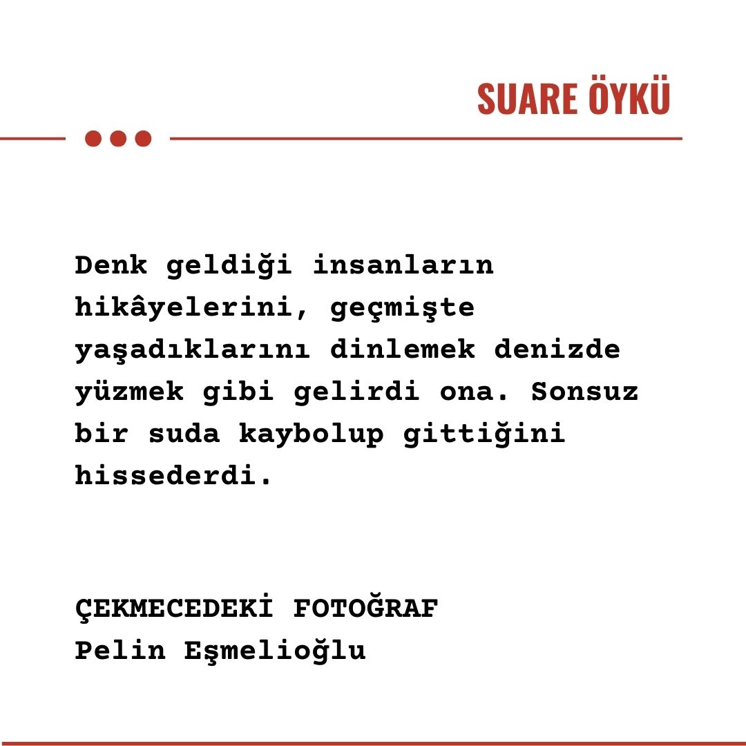 Gözlerini açtı. Fotoğrafı yeniden çekmeceye koydu. Dolabı düzenlemeye devam etti. Bir yandan da eski bir fotoğrafın ona anlattığı yaşanmışlığı düşünüyordu. İnsanların kendisinden öykülerini dinlemek keyifliydi. Fotoğrafların da dili olduğunu hep düşünürdü. İşte şimdi geçmişten gelen bir fotoğraf ona yaşadıklarını anlatmıştı.