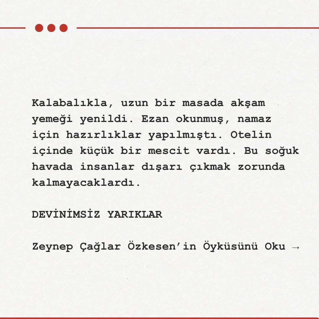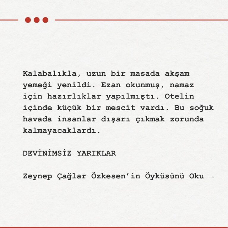 Kalabalıkla, uzun bir masada akşam yemeği yenildi. Ezan okunmuş, namaz için hazırlıklar yapılmıştı. Otelin içinde küçük bir mescit vardı. Bu soğuk havada insanlar dışarı çıkmak zorunda kalmayacaklardı. Aykut masadan kalktı. “Senin için de dua edeceğim merak etme.” Hocayı gözleriyle işaret ederek. “Çatlak bir sesi var ama sabah ezanı okurken tüylerin ürperir.” Hiç inanamamıştım, kafamı salladım gülümseyerek. Aykut; çocukluk arkadaşım, sırdaşımdı. Çeşitli işlerde dikiş tutturamamış, turizme de bir el atmak istemişti. Tur rehberi olmak yolunda ilerlemiş hem kokardını almak için hem de kafam dağılsın diye beni de buralara sürüklemişti.