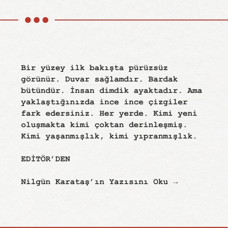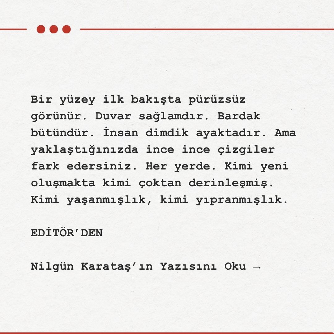 Yüzey ilk bakışta pürüzsüz görünür. Duvar sağlamdır. Bardak bütündür. İnsan dimdik ayaktadır. Ama yaklaştığınızda ince ince çizgiler fark edersiniz. Her yerde. Kimi yeni oluşmakta kimi çoktan derinleşmiş. Kimi yaşanmışlık, kimi yıpranmışlık. Kimi de içeri sızan ince bir ışığa açılan pencere…