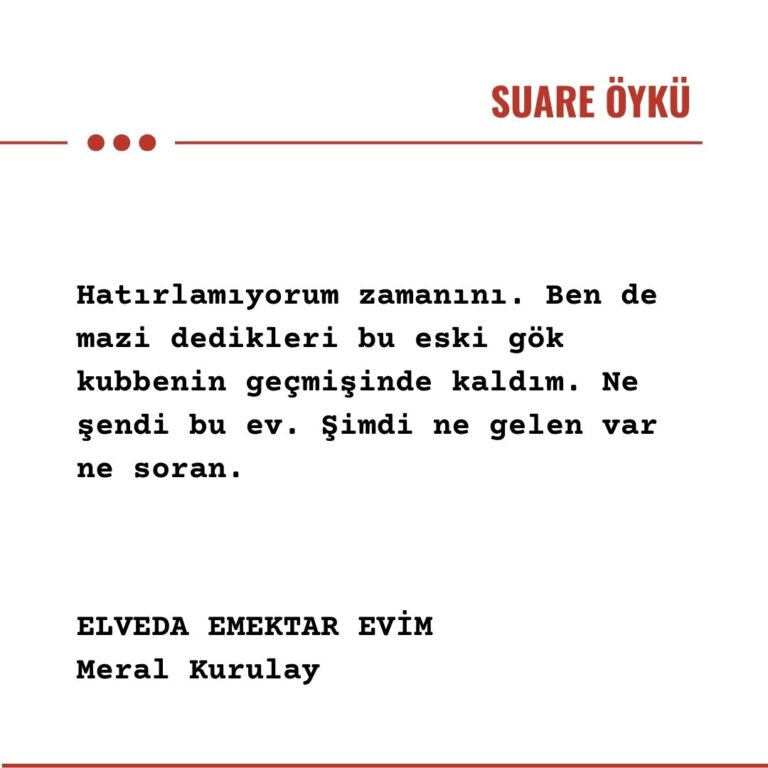 Hatırlamıyorum zamanını. Ben de mazi dedikleri bu eski gök kubbenin geçmişinde kaldım. Ne şendi bu ev. Şimdi ne gelen var ne soran. Dedim ya hatırlamıyorum. Çok uzun zamandır ev sakinlerinin zarif elleri açmadı kulbumu. Halbuki ne kadar sık çeker, çekiştirirlerdi. Hop açılırdım dışarı, hop kapanırdım içeri. Bazen sahibinden ihtiyaçtan. Günde üç defa ya da beş defadan fazla çekilirdim. Geleni gideni çok olurdu bu evin. Allah sizi inandırsın yemek sofrası hiç kalkmazdı salondaki masadan. Kolay mı misafir ağırlamak? Dedim ya şendi bu ev.