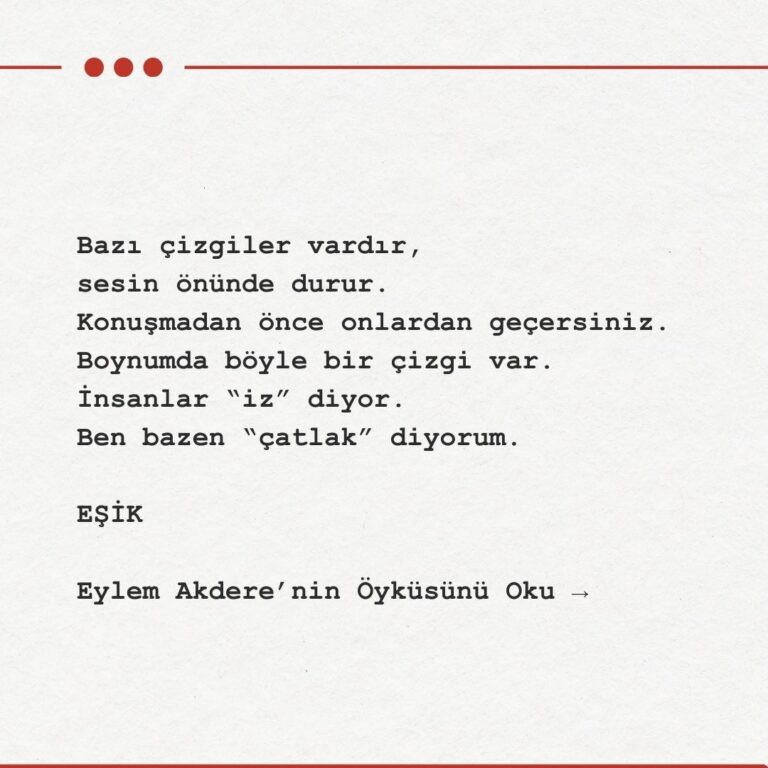 Ben bir şey demedim. Çünkü boğazımın tam ortasında, yıllardır taşıdığım o çizgi bir an için içeri doğru genişledi. Bir çatlak, yalnızca dışarıdan görünmez; bazen insanın içinde de açılır. İçeriye hava girer. İçeriye ses girer.
