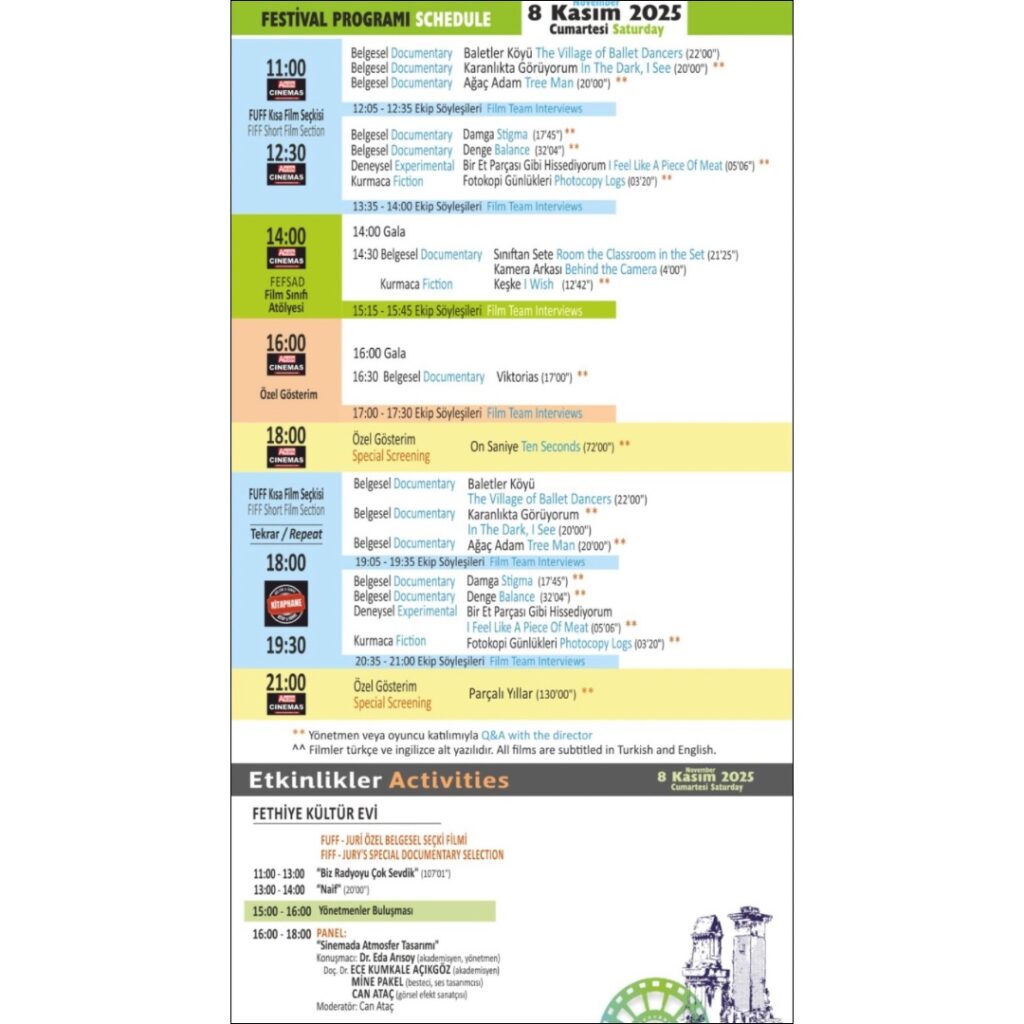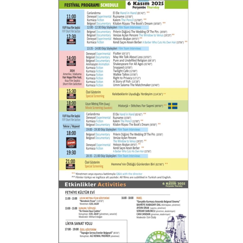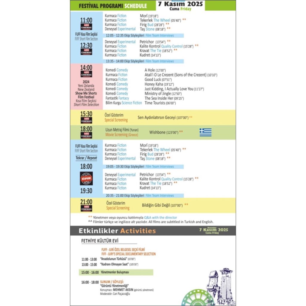 Fethiye Uluslararası Film Festivali , 5-9 Kasım 2025 tarihlerinde halka açık ve ücretsiz olarak yerli ve yabancı film gösterimleri, yönetmen buluşmaları, atölyeler ve paneller ile gerçekleşecek.