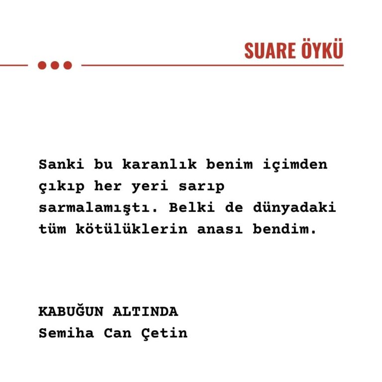 Kafamı kaldırıp gökyüzüne baktım. Karabulutlar tüm gökyüzünü kaplamıştı. Yer kara toprak, gök kara bulut… İçim ise katran karasıydı. Sanki bu karanlık benim içimden çıkıp her yeri sarıp sarmalamıştı. Belki de dünyadaki tüm kötülüklerin anası bendim.