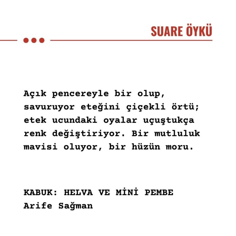 “Fotoğraf biraz sararmış mı?” diye geçiriyor aklından. “Hâlâ alışamadım biliyor musunuz?” diyor. Önüne bakıyor, kafasını kaldırıp tabağı yandaki masaya bırakıyor usulca. Çiçekli patiskadan masa örtüsü kımıldıyor huzursuzca. Eliyle çekiştirip düzeltiyor masa örtüsünü. Açık pencereyle bir olup, savuruyor eteğini çiçekli örtü; etek ucundaki oyalar uçuştukça renk değiştiriyor. Bir mutluluk mavisi oluyor, bir hüzün moru. Masa örtüsü bir yandan rüzgârla dans ederken, öte yandan kıskançlıkla çiçekli elbiseye bakıyor göz ucuyla.