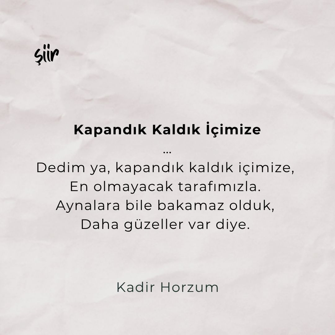 Kadir Horzum Kapandık kaldık içimize Kapandık kaldık içimize,En olmayacak yanımızla.Herkes kendi aleminde, Kendi onmaz derdinde. Mesele ne var olmak, Ne de yok olmak artık. Mesele daha fazla tüketmek. Daha fazlada yok olmak. İçimiz dışımız yaşamak. Manasız bir kargaşada, Anlamsız bir boşlukta. İsteksiz, tekdüze narsist. Dedim ya, kapandık kaldık içimize, En olmayacak tarafımızla. Aynalara bile bakamaz olduk, Daha güzeller var diye.