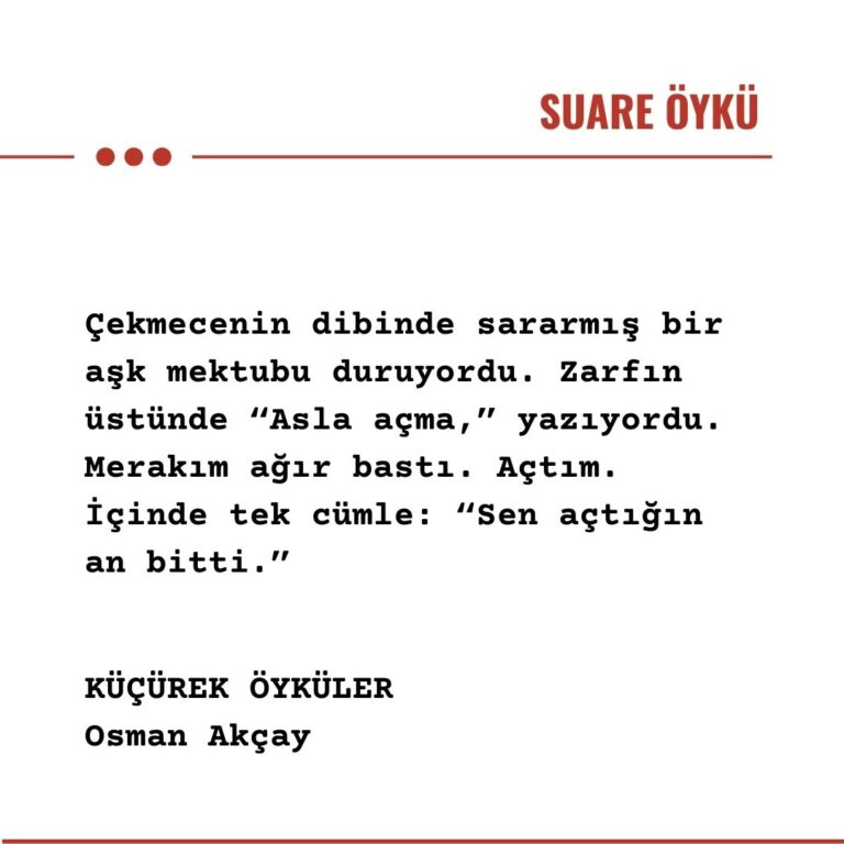 Çekmecenin dibinde sararmış bir aşk mektubu duruyordu. Zarfın üstünde “Asla açma,” yazıyordu. Merakım ağır bastı. Açtım. İçinde tek cümle: “Sen açtığın an bitti.” O gün bugündür mühürlü bir zarfın içinde nefesim kesik.