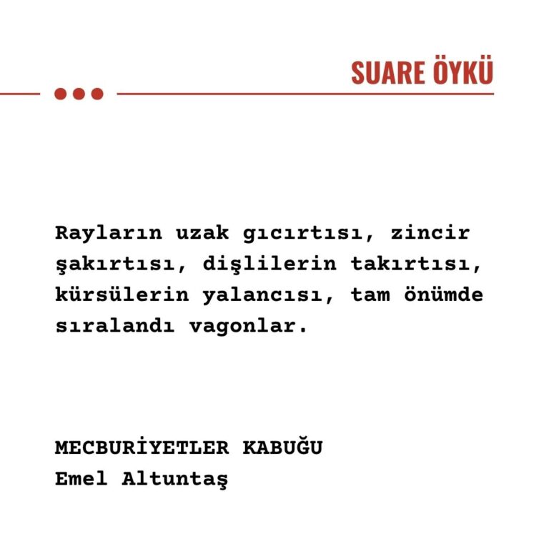 Hemen yan tarafımdaki çöp kutusuna soluk bir gazeteyi rulo yapıp tıkıştırmışlar. “Büyük Kaçış Başarısız” manşetini atmışlar. Derin bir nefes… Oh! Kaçamamışlar, tamam ama kim ne yapacaktı bunlara? Namuslu bir kürsü kaldı mı? En azından kaçamamışlar, bu da bir şeydir. Tombul parmaklı, koca kafalı, takım elbiseli, diplomalı, uyanıkların ayaklarından zincirlendiklerine eminim. Emin miyim? Rayların uzak gıcırtısı, zincir şakırtısı, dişlilerin takırtısı, kürsülerin yalancısı, tam önümde sıralandı vagonlar. Serzenişler sustu içimde.