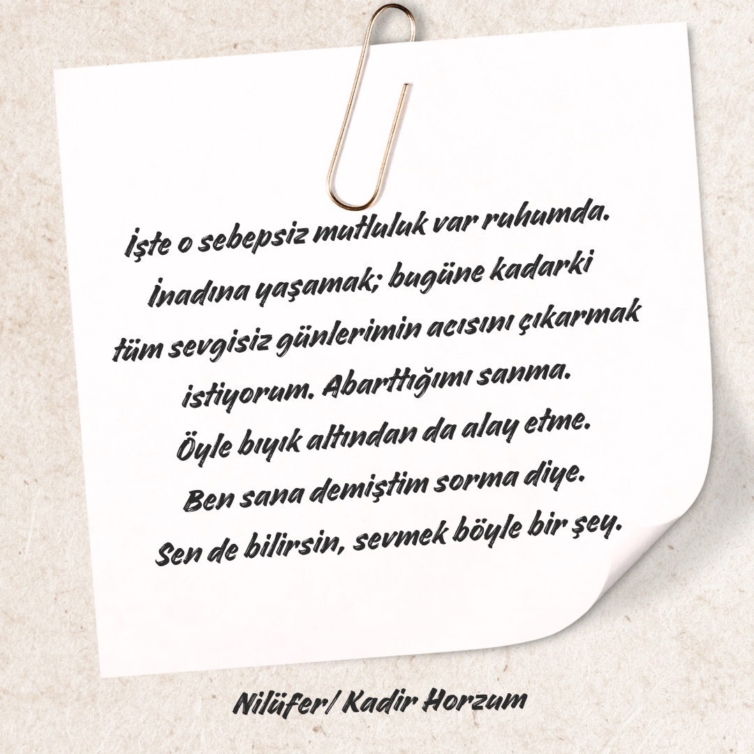 “Sorma adaşım sorma. Neden bu kadar mutluyum sorma. Anlatamam hangi havalardayım. Sanırsın o, her şeyi söylemenin mümkün olduğu, çiçeklerin gürültüyle açtığı diyarlara gittim de geldim. Sanırsın oyuncak hediye edilmiş bir çocuğum… Hani bir sabah uyanırsın ve bakarsın ki bahar gelmiş. Haber vermeden, gizli gizli hayatına girmiş. İşte o sebepsiz mutluluk var ruhumda. İnadına yaşamak; bugüne kadarki tüm sevgisiz günlerimin acısını çıkarmak istiyorum. Abarttığımı sanma. Öyle bıyık altından da alay etme. Ben sana demiştim sorma diye. Sen de bilirsin, sevmek böyle bir şey. Fakat bendeki başka şey. Tarifi imkansız. Ama yine de deneyeyim.”