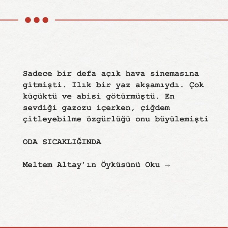 Sadece bir defa açık hava sinemasına gitmişti. Ilık bir yaz akşamıydı. Çok küçüktü ve abisi götürmüştü. En sevdiği gazozu içerken, çiğdem çitleyebilme özgürlüğü onu büyülemişti. Renkli tahta sandalyelerin olduğunu ve pembeye oturunca ayaklarının yere yetişmediğini hatırlıyor küçük kız. Bembeyaz duvarların içinde, arka taraftaki üç dört sıralı yükseltinin en önünde oturuyorlardı. Sinema çok dolu değildi. Seans başladığında, filmden çok arkalarındaki duvardan gelen sesler ilgisini çekmişti. Sessizce, fısıltıyla konuşsalar da film başlamadan önce de onları duymuştu. Duvardaki derin bir çatlağın arkasında, ne işler çevirdikleri çok ilgi çekiciydi.