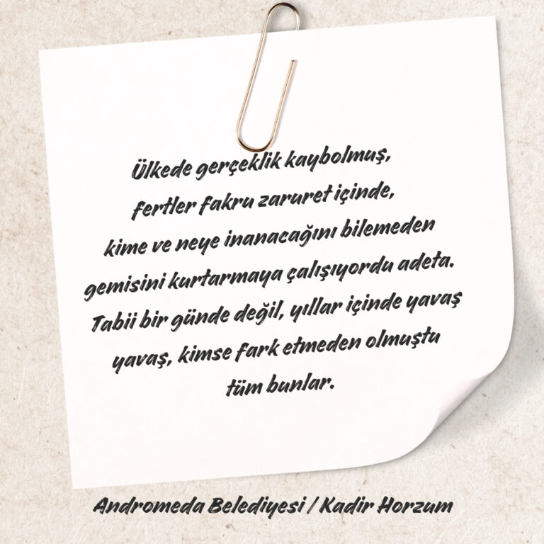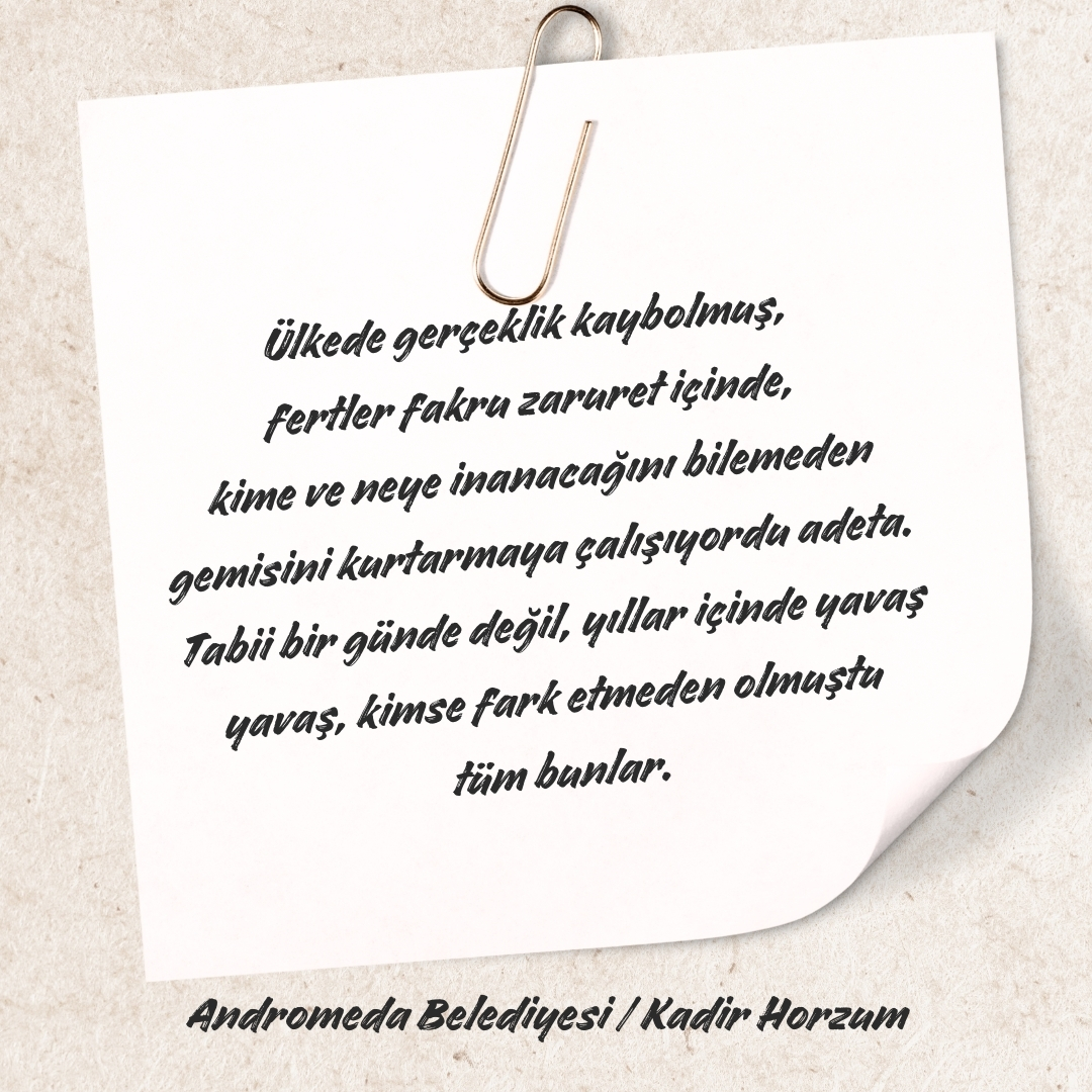 Uçsuz bucaksız evrenimizde, dünyaya milyonlarca ışık yılı uzaklıkta Andromeda galaksisi vardır. Bilim insanlarının hesaplarına göre yaklaşık dört buçuk milyar yıl sonra Samanyolu galaksisi ile çarpışacak olan bu galakside, Dünya benzeri bir gezegende, var olmaya çalışan bir ülkenin vatandaşıydı Nihat Bey. Ülkesi daha çok gençti ve kurucu liderlerinin kulluk sisteminden çıkarıp birey yapmaya çalıştığı fertler, “demokrasi” diye adlandırılan yeni yönetim sistemini anlayamıyor, onu kişisel çıkarları doğrultusunda kullanıyordu. Ülkedeki kıt maddi kaynaklar herkese yetmediği için de altta kalanın canı çıkıyor, feodal düzen gün geçtikçe güçleniyordu. Hatta bu durum öyle bir hâl almıştı ki bu kaynakları ele geçiren bazı fertler, kaynakları kaybetmemek adına devletin ilk kurulduğu yıllarda feodalite ve skolastik düşünceye karşı yapılan devrimleri dahi kötülüyordu. Ülkede gerçeklik kaybolmuş, fertler fakru zaruret içinde, kime ve neye inanacağını bilemeden gemisini kurtarmaya çalışıyordu adeta. Tabii bir günde değil, yıllar içinde yavaş yavaş, kimse fark etmeden olmuştu tüm bunlar. O günleri yaşamış bazı kişilerin deyimiyle ilk darbe, atalarının ölmesinden hemen sonra eğitim sistemine vurulmuş, aklın ve dürüstlüğün yerine, bayraklarına selam vermeden geçecek kuşun dahi yuvasının bozulmasını emreden, hamasi bir kolektif bilinç inşa edilmeye çalışılmıştı okullarda. Sonuçta da oyunları savaş, savaşları da oyun gibi gören, sevmenin bedeli sadece ölüm olan politik bir toplum yaratılmıştı ülkede. Nihat Bey de bu bilinçle yetiştirilmiş fertlerdendi. Küçük bir şehirde doğmuş, askerlik dışında oradan hiç çıkmamıştı. Her ne kadar şimdilerde kendini haksızlığa uğramış gibi hissediyorsa da genel olarak ülkesinden ve inandığı tanrısından memnun bir hayatı olmuştu. Zira hiç hırsı olmadığı için bugüne kadar kötülükle sınanmamıştı. Sınandığındaysa ne olduğunu bile anlayamadan sınıfta kalmıştı.