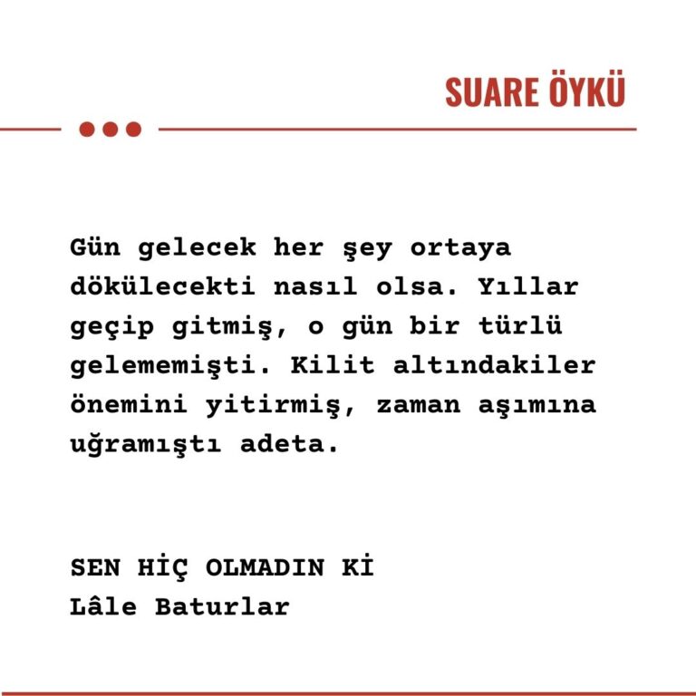 Bir yandan da “ne olursa olsun babası” gerçeği vardı. Bu mantıkla, her şey olağan ve yolundaymış gibi görünse de “ama” demeden olmuyordu. Eksik olan ne varsa o kelimede saklıydı. Bugüne kadar tek bir arkadaşını babasıyla tanıştıramamıştı. Kendini bildi bileli doğum günlerinde beraber olamadı. Yeni yıl kutlamaları sadece telefon aracılığı ile yapılırdı. Sonuç itibariyle, birbirini uzaktan seven, birbirleri için hiçbir fedakârlığa katlanmayan, sınırlı zamanları bile heba eden iki insandan ibarettiler. Ona karşı olan hisleri sevgi, nefret ve öfkenin mükemmel karmasıydı. Gün gelecek her şey ortaya dökülecekti nasıl olsa. Yıllar geçip gitmiş, o gün bir türlü gelememişti. Kilit altındakiler önemini yitirmiş, zaman aşımına uğramıştı adeta.