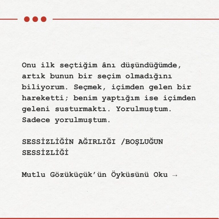 O eve her girişinde, mekân biraz daha daralıyordu. Duvarlar yaklaşmıyordu belki ama nefes alacak alan azalıyor, içim sıkışıyordu. Oturma odasında otururken bile, sanki yanlış bir sandalyeye oturmuş gibiydim. Kendi sesim, içimde yankılanmıyordu artık. Kendi sesini duyamayan bir kadın, bir süre sonra bedenini de duyamaz.
