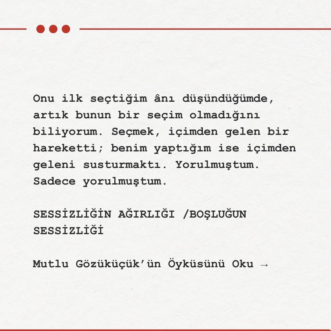 Sessizleşmesini önce yorgunluğa yordum. Sonra rutine. Sonra yaş almaya. Sonra kadın olmaya. Kadınların içindeki kırılmaları genellikle doğallaştırırız. Böyledir, deriz. Kadınlar karmaşıktır.
