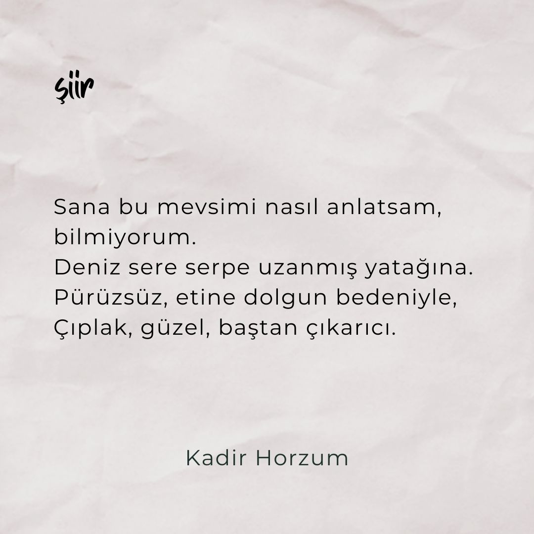 İsimsiz Sana bu mevsimi nasıl anlatsam, bilmiyorum. Deniz sere serpe uzanmış yatağına. Pürüzsüz, etine dolgun bedeniyle, Çıplak, güzel, baştan çıkarıcı. Ve meyvelerin en yasağıyla sesleniyor. Vakit dar! Her an geç! Ayıpsa ayıp, günahsa günah! Sokul koynuma da sarayım seni. Hisset, yasak edilenin hazzını. Hissettir, arzularını her zerremde. Sana bu mevsimi nasıl anlatsam, bilmiyorum. Gökyüzü kızgın, … ŞİİR – KADİR HORZUM okumayı sürdür