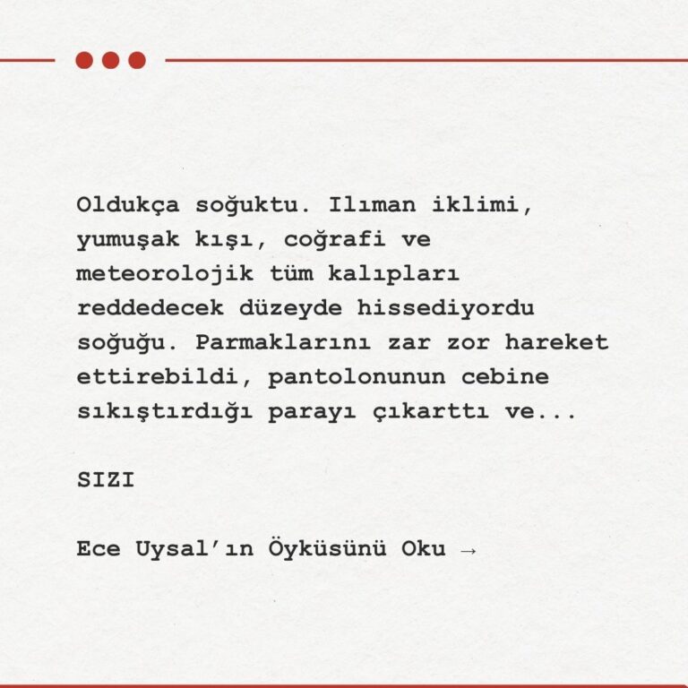 Soğuktu. Hak edilmiş yalnızlığında, bu soğuk, en yüzeyinde dışarıdan görülebilen açıklıklarından, ruhunun en derinlerine ilerliyor, geçtiği her yeri soğuktan yakarak acıtıyor, sızlatıyordu.