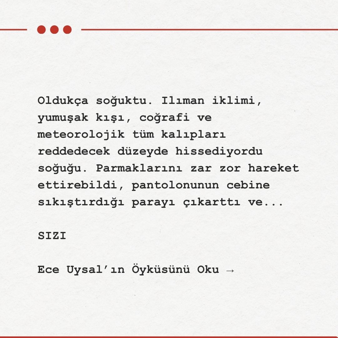 Oldukça soğuktu. Ilıman iklimi, yumuşak kışı, coğrafi ve meteorolojik tüm kalıpları reddedecek düzeyde hissediyordu soğuğu. Parmaklarını zar zor hareket ettirebildi, pantolonunun cebine sıkıştırdığı parayı çıkarttı ve hemen ilerideki büfeden bir paket sigara aldı. Paketin içinden bir dal çıkartıp yaktı. Yine sızlıyordu. Yine soğuktu, buz gibiydi ve yine sızlıyordu aynı yer.