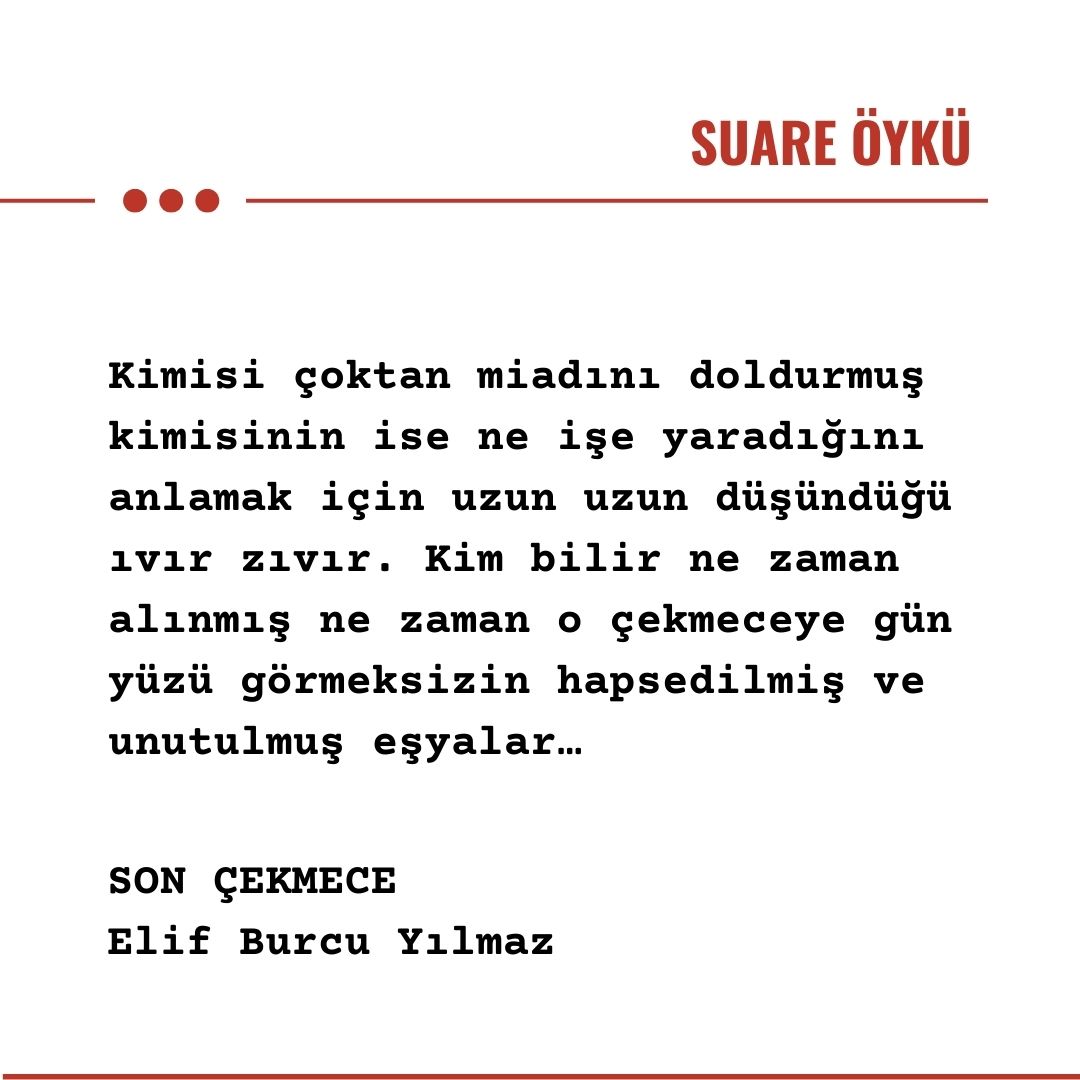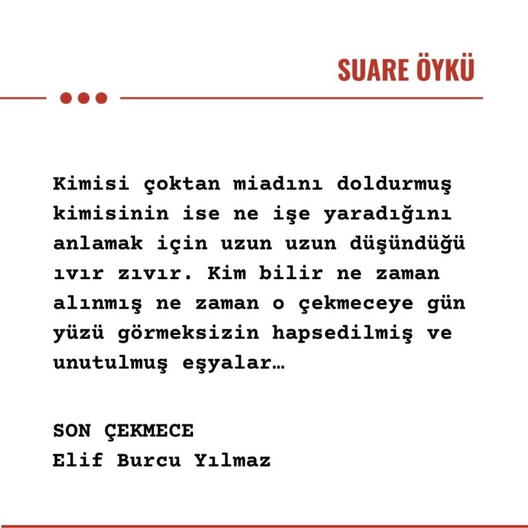 Sıkışan çekmeceyi zorla açtı. İçinde biriken onca şeyi boşaltıp işe yaramayanları ayıklayacaktı. Evdeki onlarca çekmeceye yaptığı gibi. Günlerdir işten eve gelip yaptığı gibi. İşten eve gelip az bir şeyler atıştırıp sıraya koyduğu evi düzenleme işine devam ettiği yorucu bir akşam daha… Derin bir nefes aldı. Rahmetli anacığının hep sonra lazım olabilir diye atmaya kıyamadığı onca şeye baktı. Kimisi çoktan miadını doldurmuş kimisinin ise ne işe yaradığını anlamak için uzun uzun düşündüğü ıvır zıvır. Kim bilir ne zaman alınmış ne zaman o çekmeceye gün yüzü görmeksizin hapsedilmiş ve unutulmuş eşyalar…