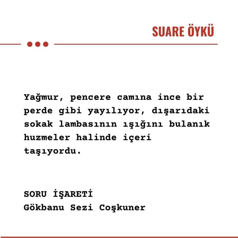 “Off! Yeter artık! Böyle şeyler yazmak istemiyorum!” diyerek yumruğunu yazı masasına indirdi. Üniversite yıllarında bir eskiciden aldığı Remington daktilonun soru işareti tuşu havaya fırlayıp yumruğunu gevşetmediği elinin yanına düştü. Aynı anda elini gevşetti. Masasından eksik olmayan Kulüp rakı dolu kadehinden dolgun bir yudum aldı. Kâğıdı daktilodan çekerken yırtılan köşelerini fark etmedi. Sağ cebinden işlemeli pirinç anahtarı çıkarıp sağındaki çekmeceyi açtı. Onlarca köstekli saatin altında birikmiş kâğıt yığının en üstüne elindeki kenarları yırtık kâğıdı özenle yerleştirdi. Daktiloya yeni bir kâğıt taktı. Rakı kadehinin yanındaki kum saatini yeniden ters çevirdi. Soru işareti tuşunun yeri boş kaldı.
