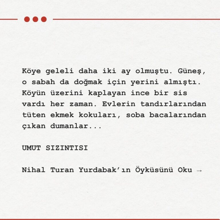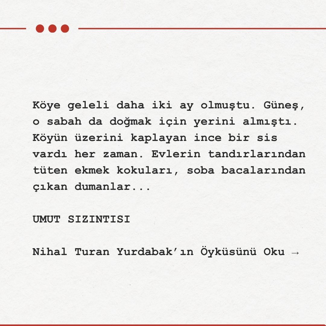 “Tamam Hayri abi, o zaman ben eve gideyim artık,” dedim ve yine bata çıka çamurlar eşliğinde evin yolunu tuttum. Giderken birkaç kadının taşın üzerinde oturup lafladıklarını gördüm. Bu sefer selam vermekle kalmayacak yanlarına gidecektim. Aylardır iki kelimenin belini kıramamanın vermiş olduğu yalnızlık duygusu koymaya başlamıştı çünkü.