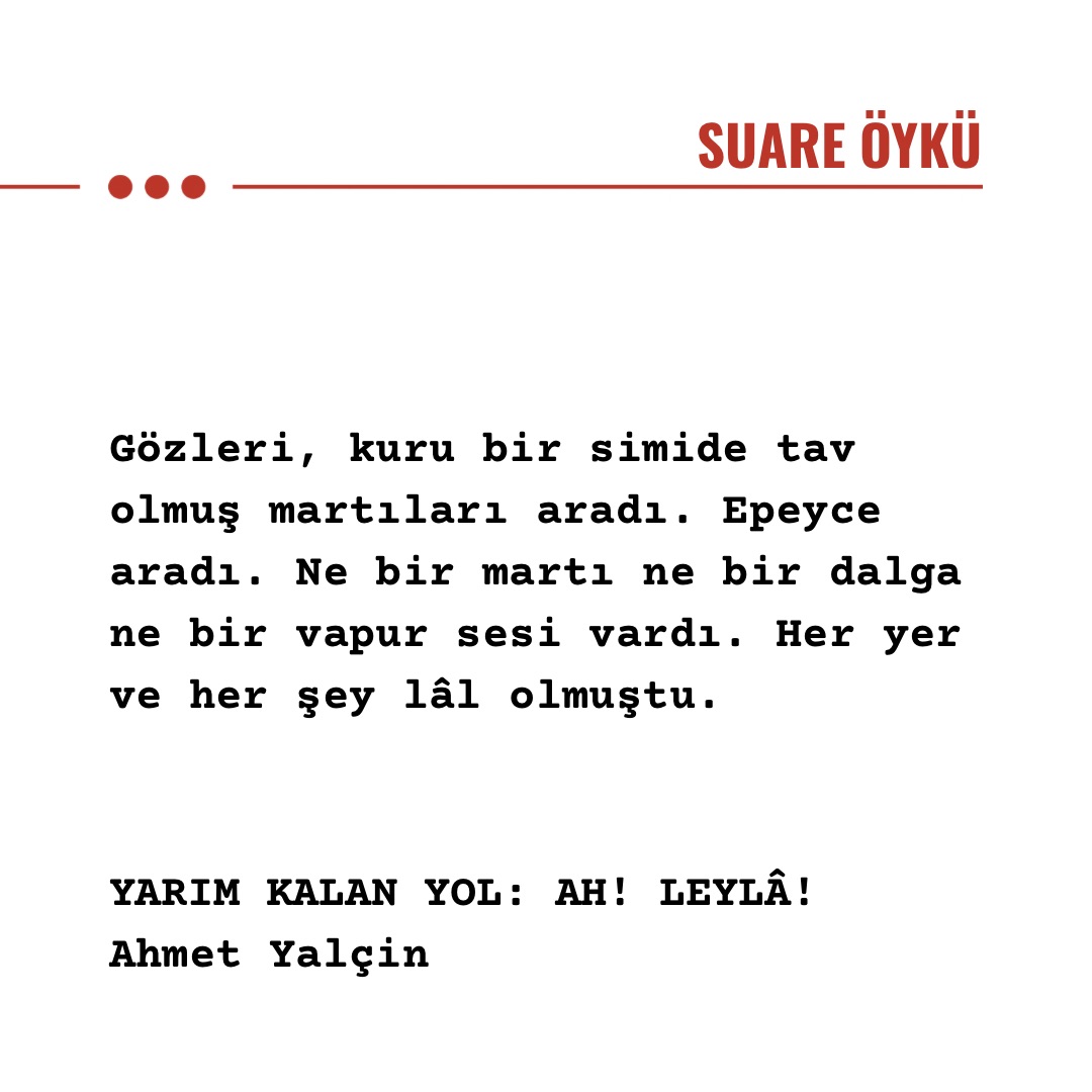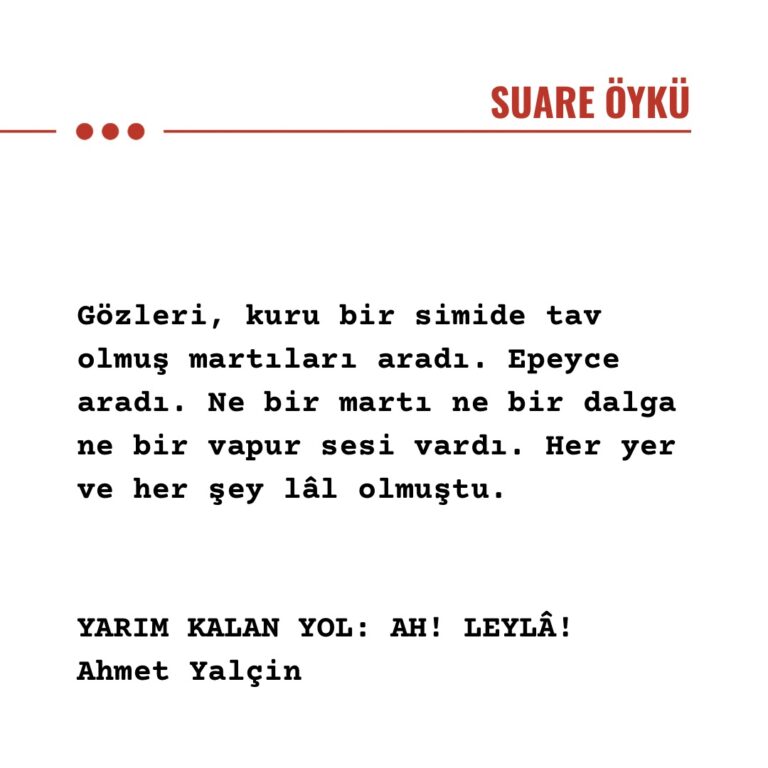 Beklemek yakıcıydı, onu incitiyordu. Yolda yürümek ise daha yakıcı daha inciticiydi. Ne yapacağını bilmeden öylece durdu, lâl olmuş âleme kulak kabarttı. Sesler uzaktan çok uzaktan geliyordu. Leylâ’nın sesini duyar gibi oldu, başını kaldırdı, kızıl gözlerle karşısına konan martıyla göz göze geldi. Martının bir şeyler söylemesini bekledi, yalvaran gözlerle dakikalarca martıya baktı. Sonra diğer taraftan Leylâ’nın sesini duyar oldu. O tarafa yöneldi. Bir simitçi “Simit! diye avazı çıktığınca bağırıyordu. Bir ekmek arayışında simitçi çok içten bağırıyordu. Hayatı bu bağırışın bulacağı yankıya bağlıydı. “Leylâ!” diye bağırsaydı keşke diye içinden geçirdi. Hayatı o bağrışın peçesindeydi. Simitçi sesiyle uzaklaştı.